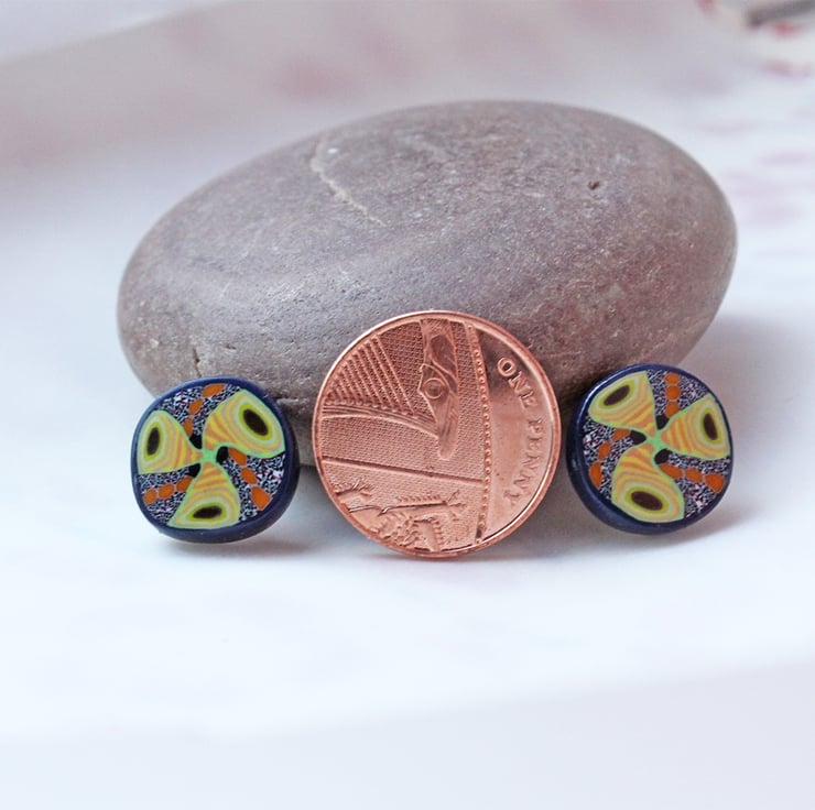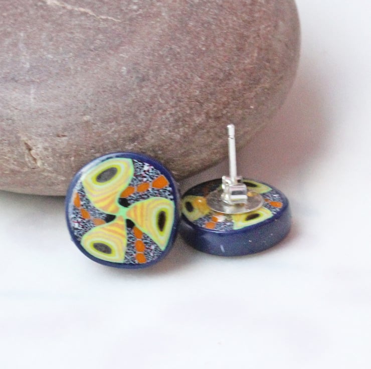 Lovely hand-crafted circular tiles in a sophisticated swirl of colours are here highly polished and fitted with silver pins to give sophisticated looking and colorful ear studs.They measure 15mm across and are 4mm thick and are made from polymer clay and are light and comfortable to wear. They have been finely polished and finished.