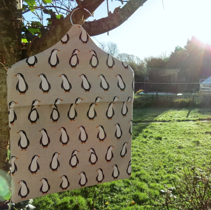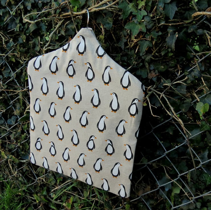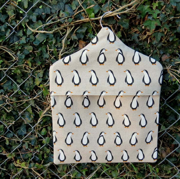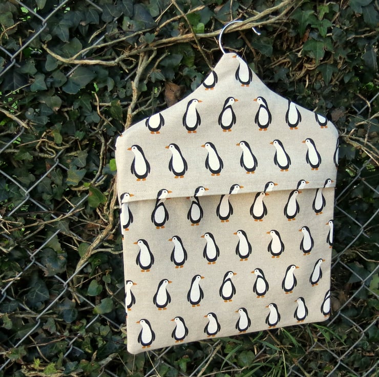 The lining is a beige and white polka dot cotton, and it contains a sturdy wooden coat hanger.