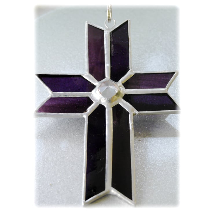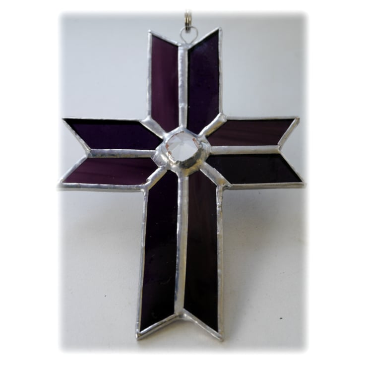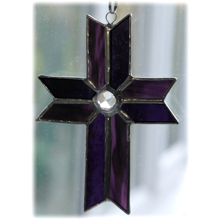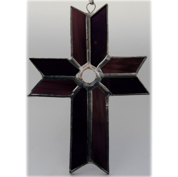 It is a cross made from 2 tones and texture of beautiful purple glass to give it a slight 3-dimensional effect..