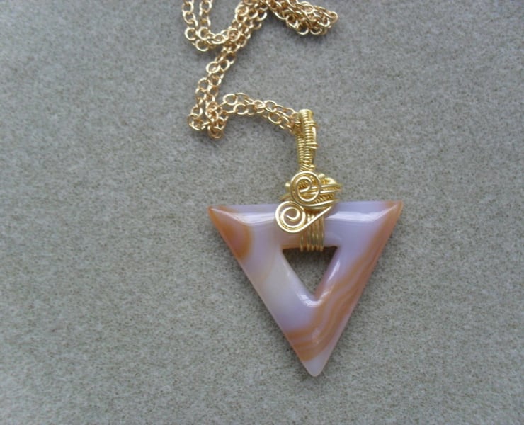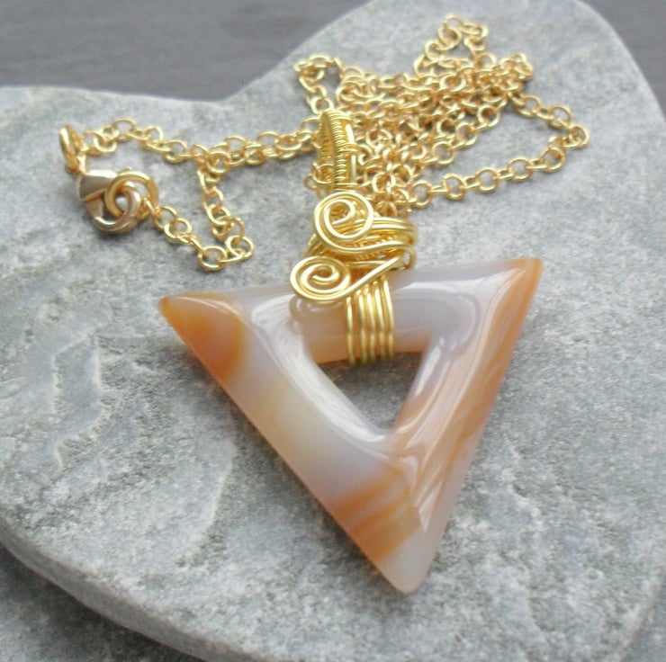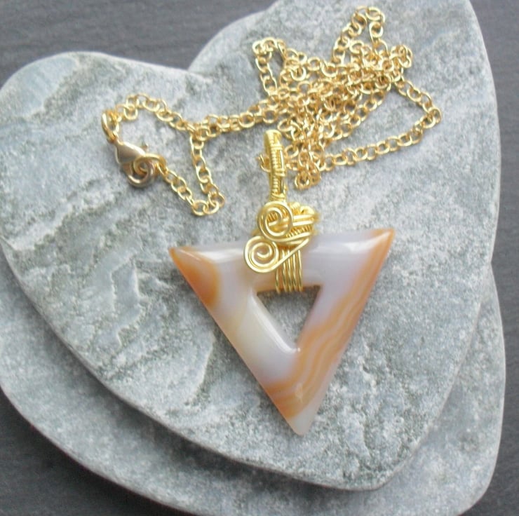 Carnelian triangle shaped semi precious gemstone which has been wire wrapped with gold plated wire and has swirls of the wire to add a little decoration.