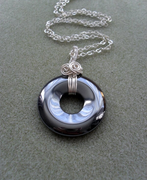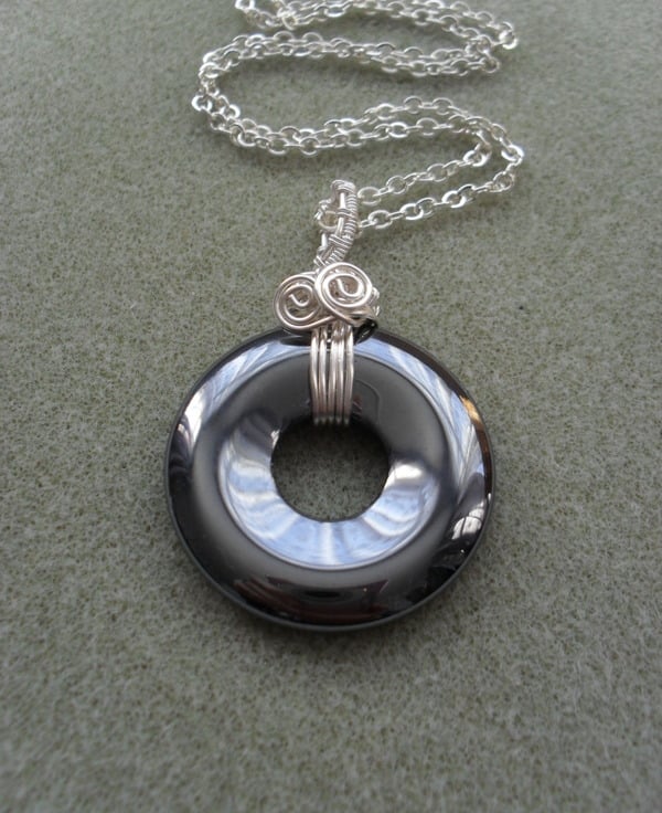 Haematite doughnut shaped semi precious gemstone which has been wire wrapped with silver plated wire which has swirls of the wire to add a little decoration.