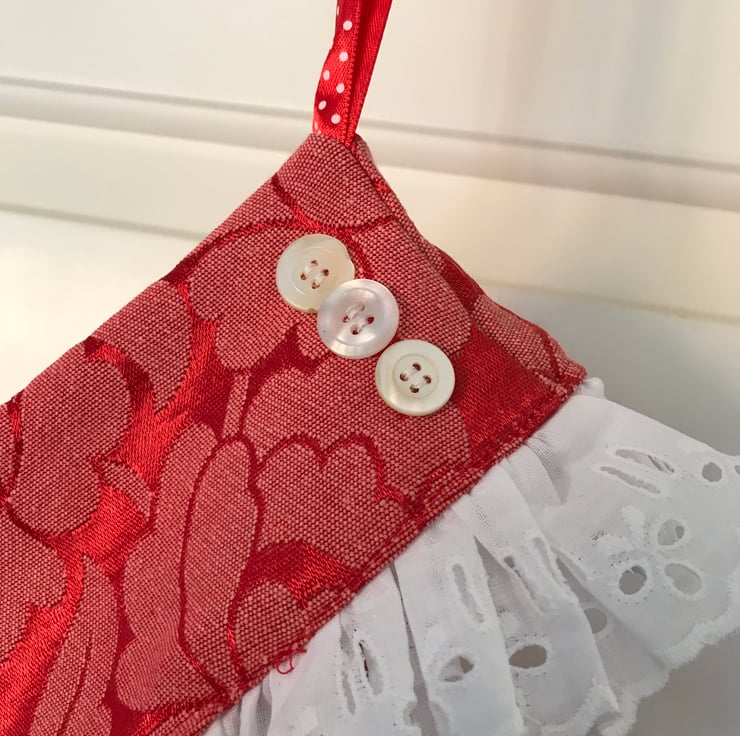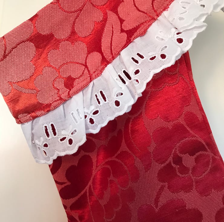 Stocking made from reclaimed vintage 1950s curtain fabric, rich and luxurious. The stocking is fully lined and trimmed with white broderie anglaise, finished with 3 small pearly buttons and a spotted ribbon loop.