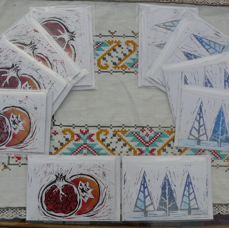 Hand printed lino cut greetings card in a pomegranate design.