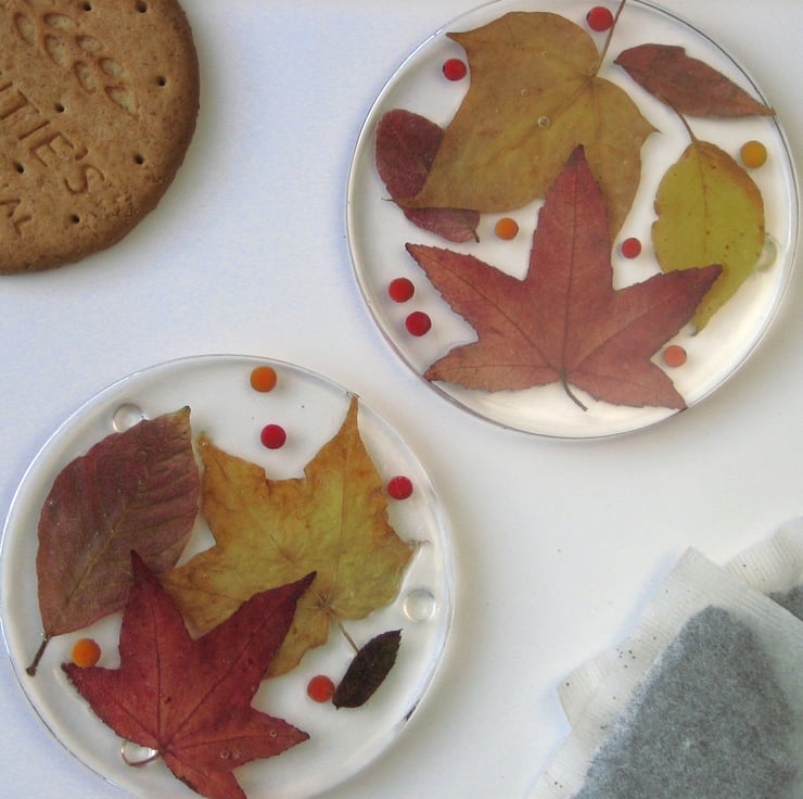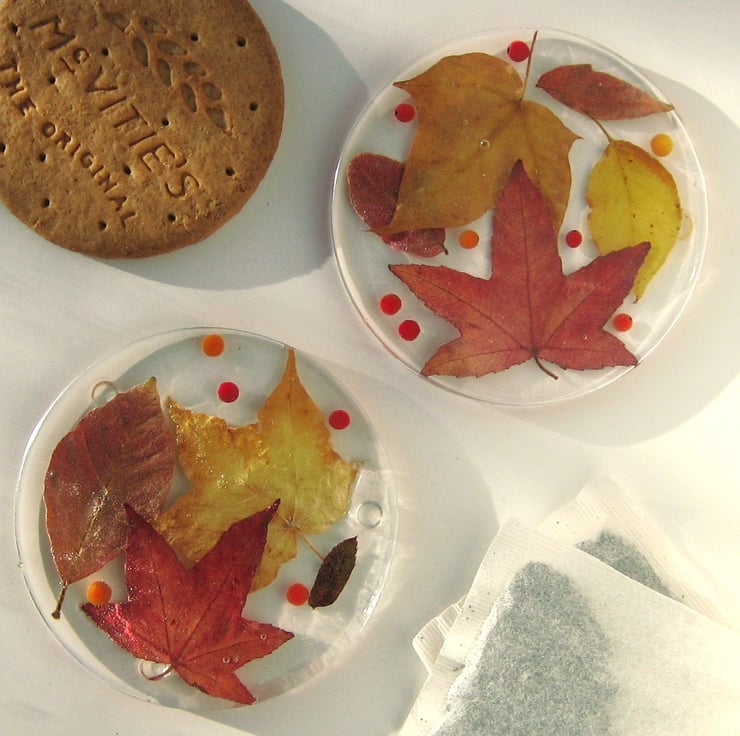 Beautiful preserved autumn leaves set in resin, pair of 9cm coasters.