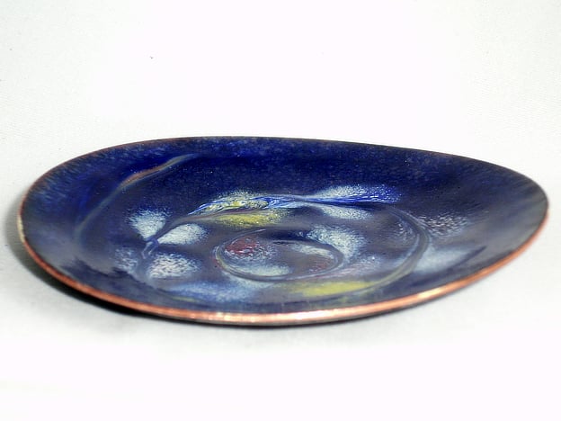 I have built up a base of clear enamel over a copper dish then added a layer of deep blue. After firing this I added piles of white enamel and scattered transparent firing gold and red enamel that would show their colour over the white on some of them. When the piece reached red heat in the kiln I drew through the surface with a steel tip to create the unique, random pattern. The dish has a textural element in that there are places where the surface has set smooth but uneven after being drawn through.