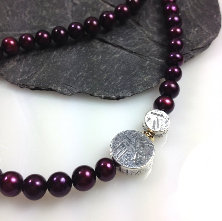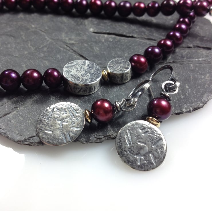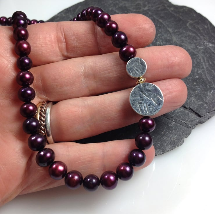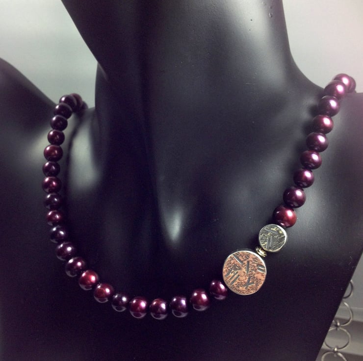 Lush plummy burgundy pearls with silver and gold beads.