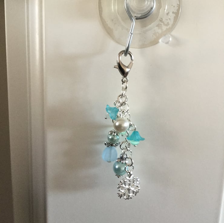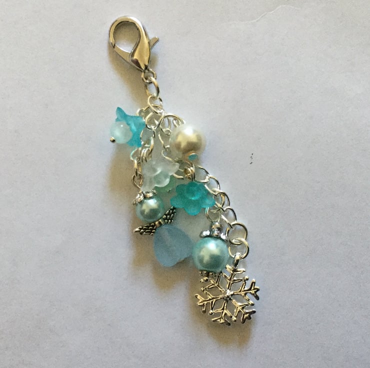 It is attached to a little piece of chain together with a variety of other charms inc.pearl beads, beaded flowers and a pretty snowflake in white metal.