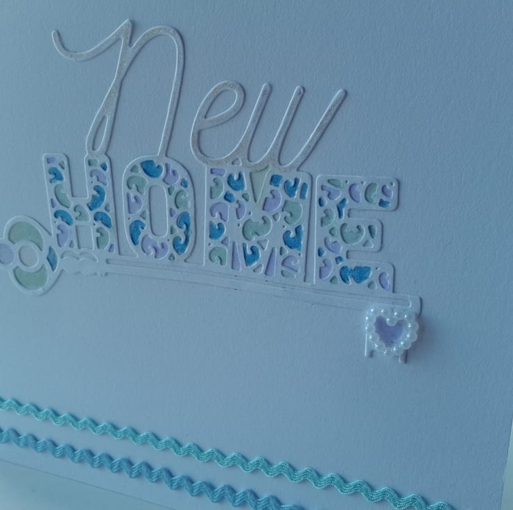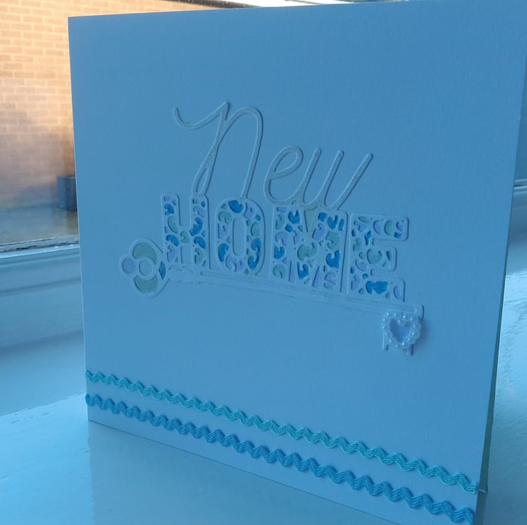 A completely handmade and uniquely designed card. Consisting of new home die cut from white card mounted onto pristine white quality card. Hand coloured in pastel shades and silver highlighter. Finished off with a pretty pearl heart and two rows of Ric rac ribbon in co-ordinating colours.