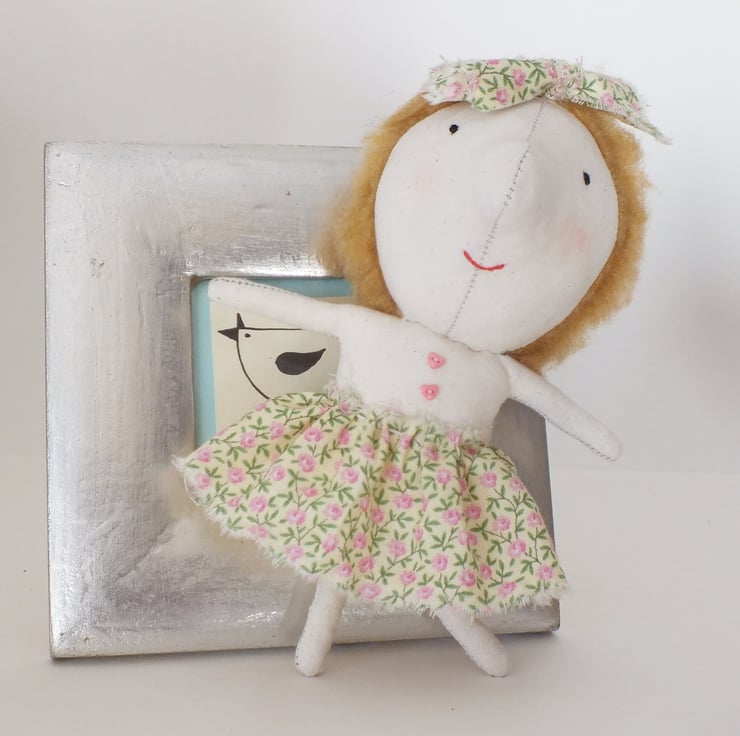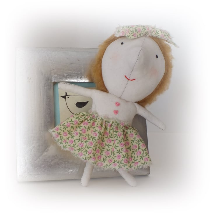 Little dolly is made from calico with fur fabric hair,embroidered features and a little cotton skirt and bow. Her arms and legs are wired ,so you can pose her and she has 2 tiny pink buttons stitched to her chest.