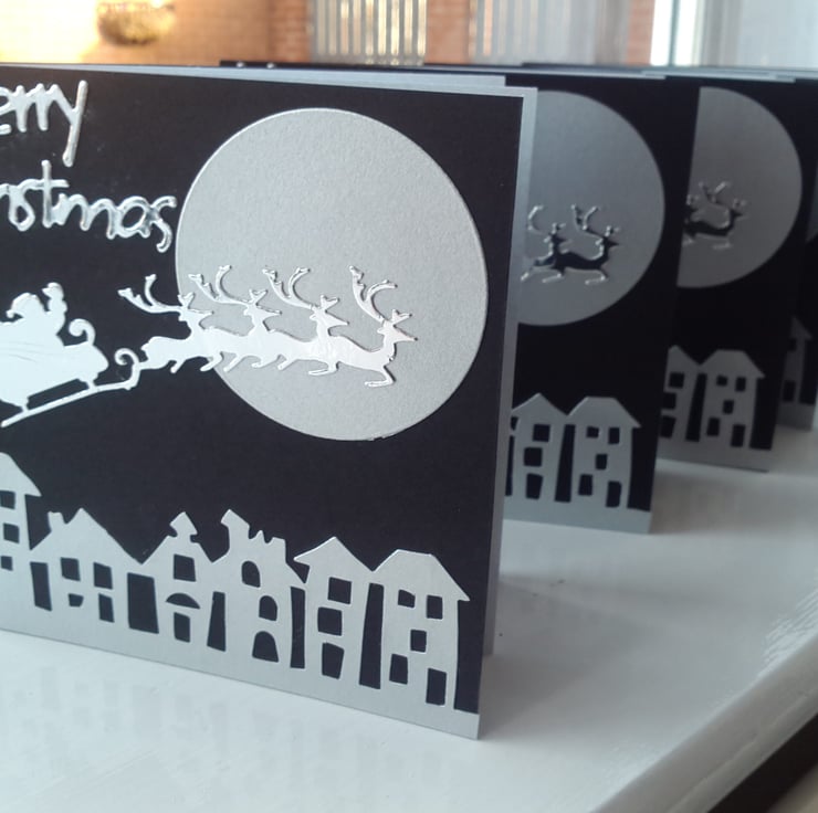 Completely handmade and uniquely designed pack of 5 cards same design and colourways. Consisting of santa and his sleigh and reindeer, full moon and row of houses all die cut from shiny and Matt silver card. Mounted onto quality black card. Finished off with a diecutt merry Christmas from silver mirri card.