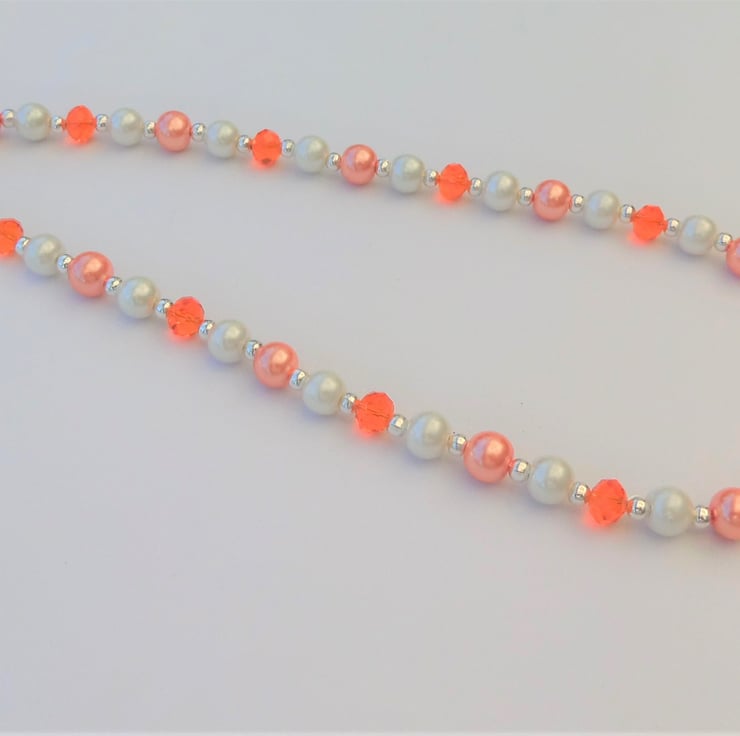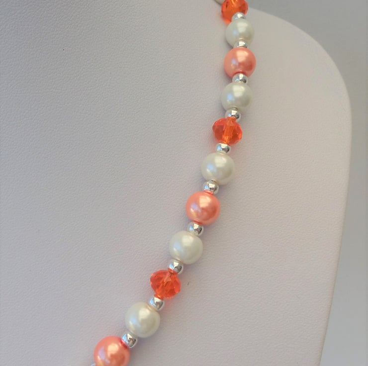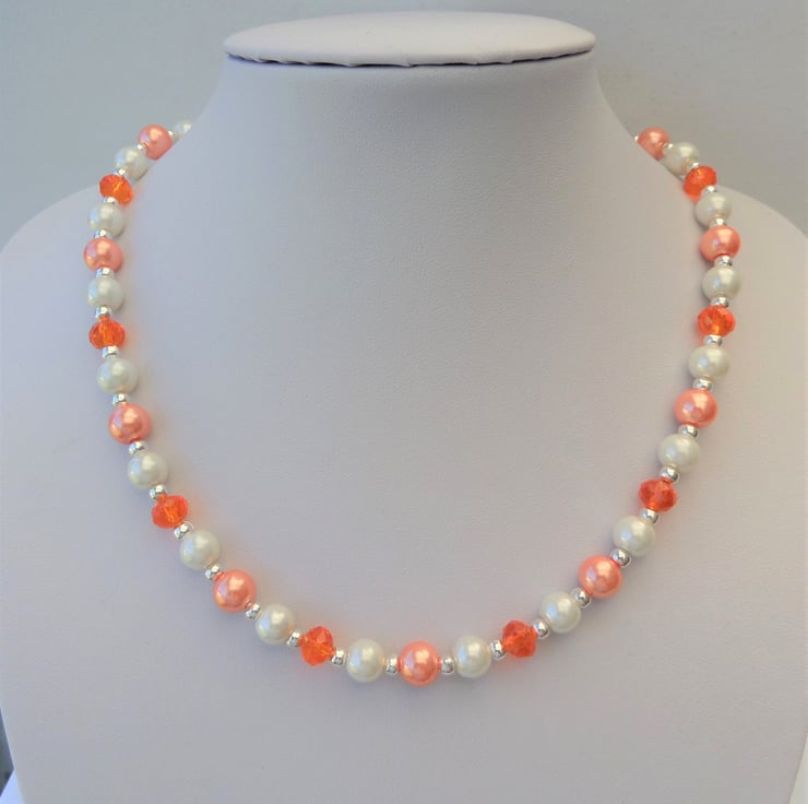 Necklace made with orange faceted rondelles, 8mm peach and cream/ivory glass pearls, and 4mm silver plated spacer beads.. Measures approximately 18.5 inches and fastens with a silver coloured lobster clasp.