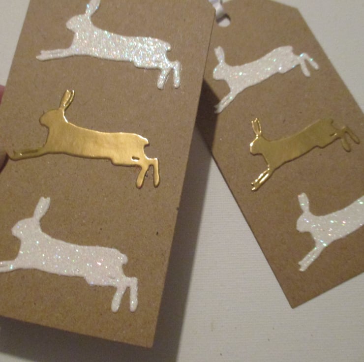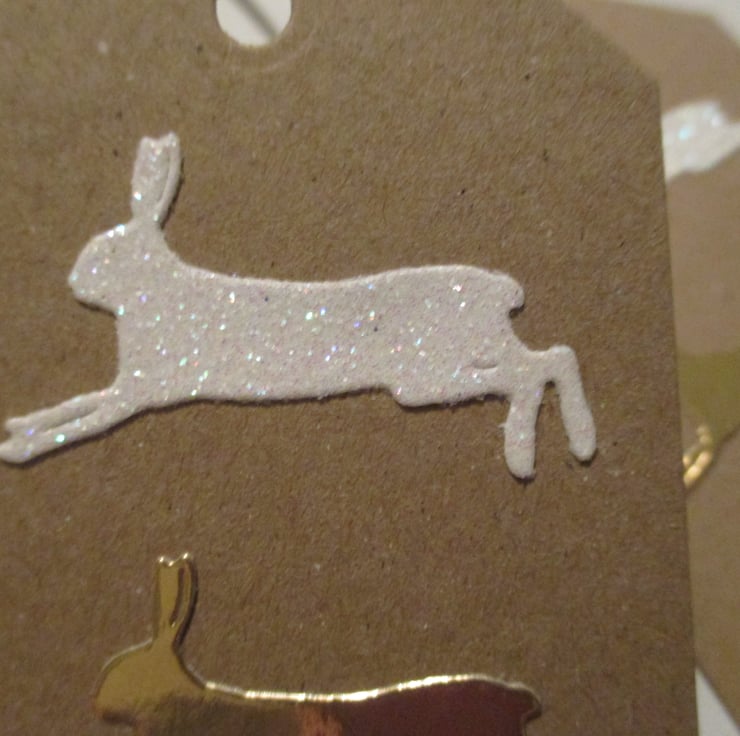 A piar (2) of hand crafted gift tags featuring die cut bunnies.