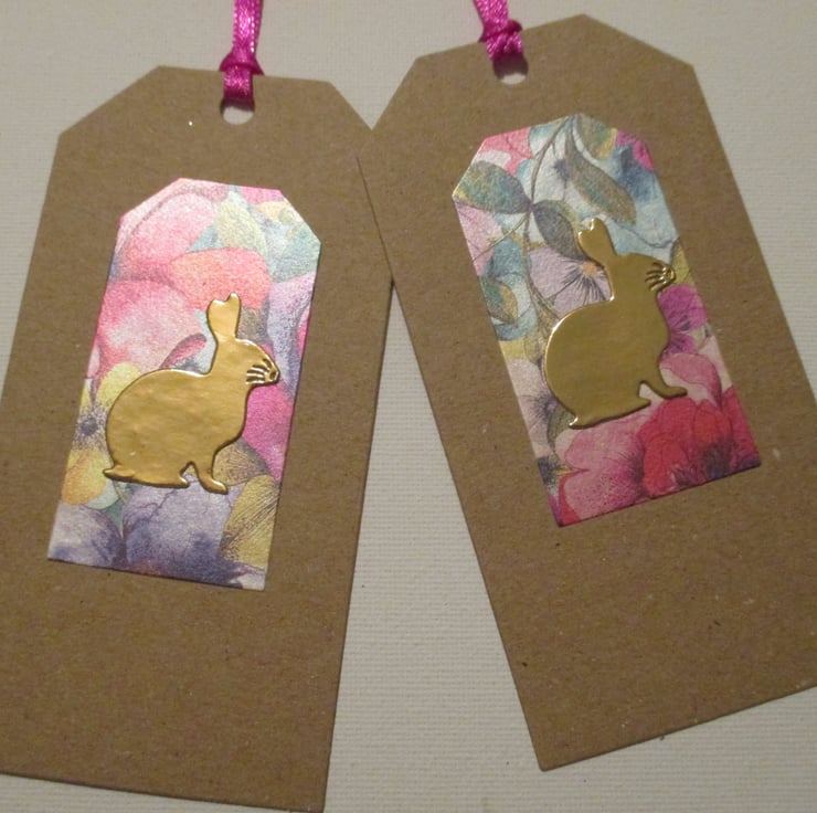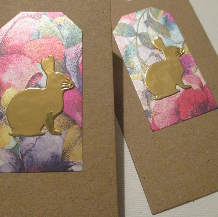 A piar (2) of hand crafted gift tags featuring die cut bunnies.