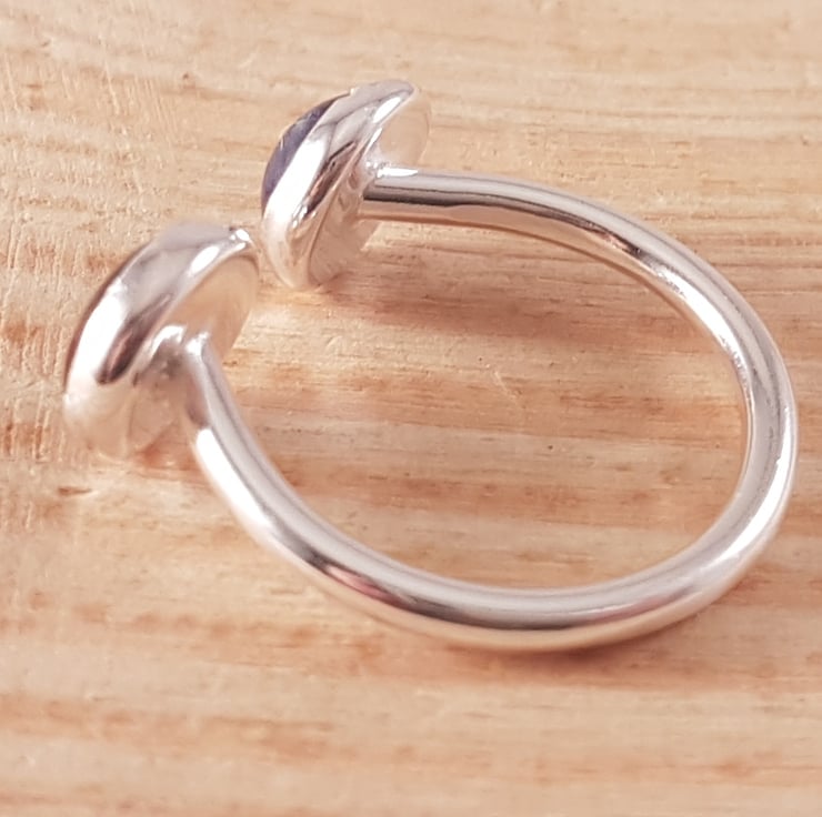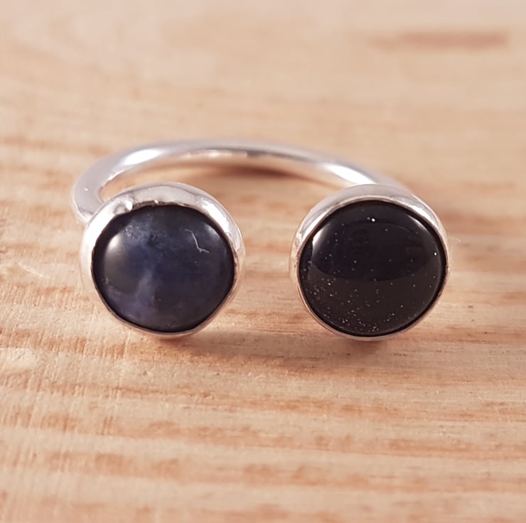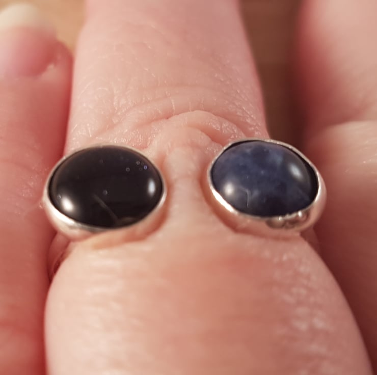A simple but effective blue gemstone ring. 8mm Blue Goldstone and Sodalite gemstones have been set in cabochon settings. They have been soldered to some 2mm sterling silver wire and bent to form an open top ring.