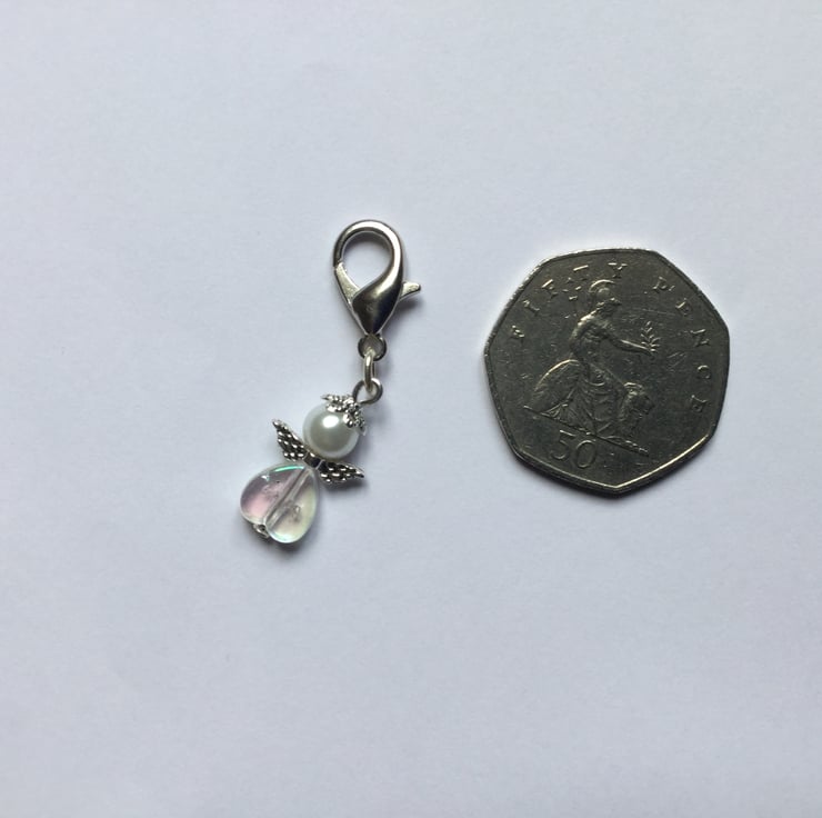 I have made this small beaded Angel charm with a clear iridescent bead and a white glass pearl bead.