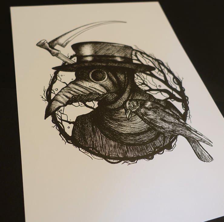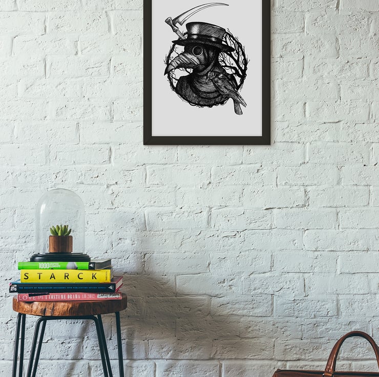 This horror inspired illustration of a Plague Doctor is printed on high quality uncoated paper stock that really enhances the beautify of this traditional illustration. Frame is not included.