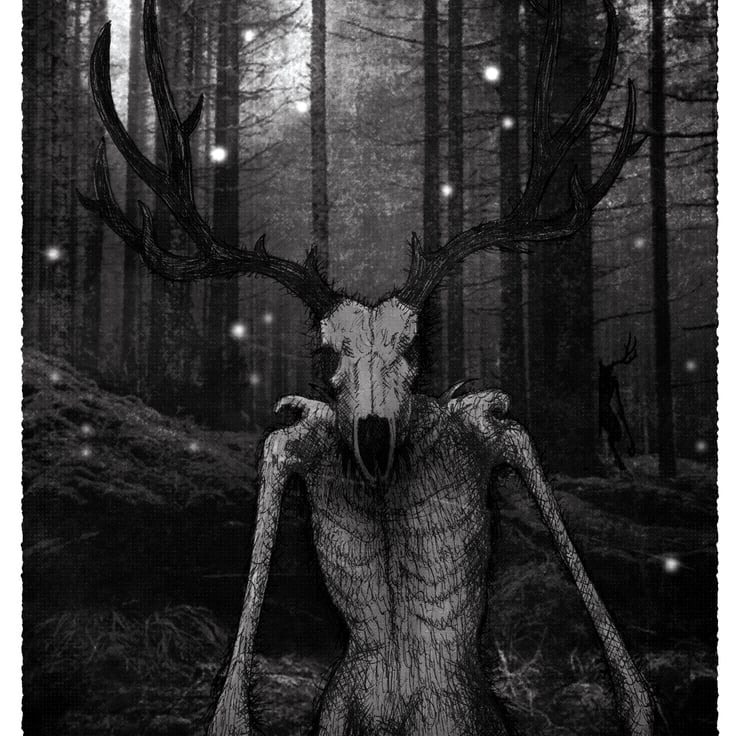 This illustration is inspired by the legend of the Wendigo. "With its bones pushing out against its skin, its complexion the ash gray of death, and its eyes pushed back deep into their sockets, the Wendigo looked like a gaunt skeleton recently disinterred from the grave."
