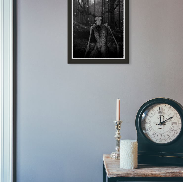 This Wendigo illustration, inspired by horror and mythology, is printed on high quality satin silky paper stock that really enhances the colour of this atmosphere of this spooky artwork. Frame is not included.