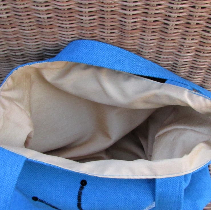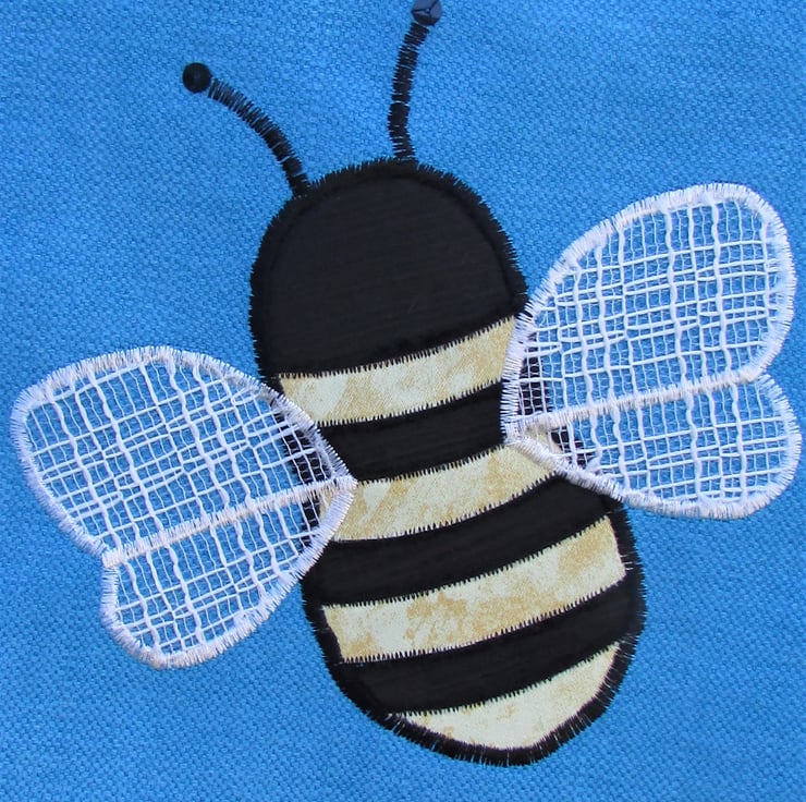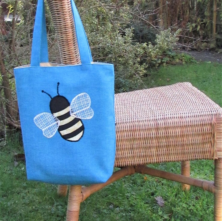 A Bumble Bee tote bag in a turquoise fabric with an applique Bumble Bee. The bee is made from black satin fabric and golden yellow fabric stripes. The stripes have been edged with a machine-stitched black narrow zigzag, which gives the appearance of the fuzzy coat of a Bumble Bee. The wings are made from a white lacy net fabric and the bee's antennae have been machine-stitched in black satin stitch and embellished with black sequins. The bag is fully lined with a lovely golden yellow fabric with a slight sheen.
