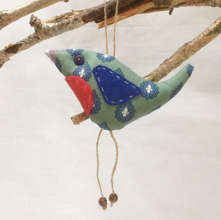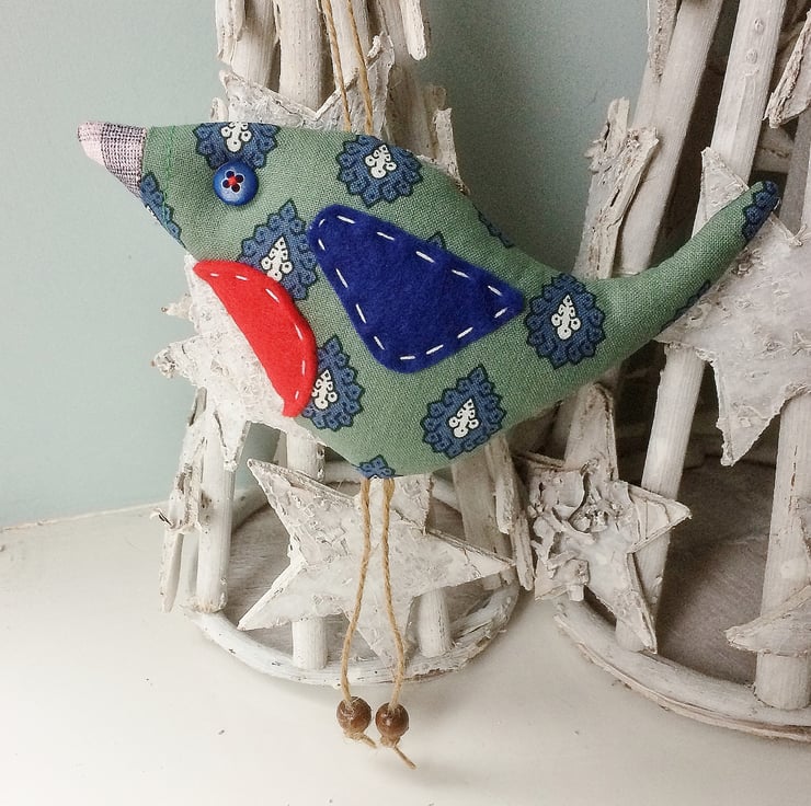 With string legs and bead 'feet', button eye and felt wings, and padded with new toy stuffing. He measures approx 14cm from the tip of his beak to the end of his tail and 12cm from the top of his wings to the tips of his toes.