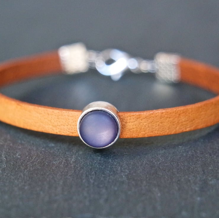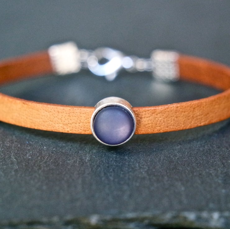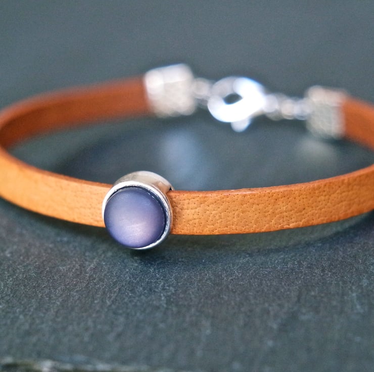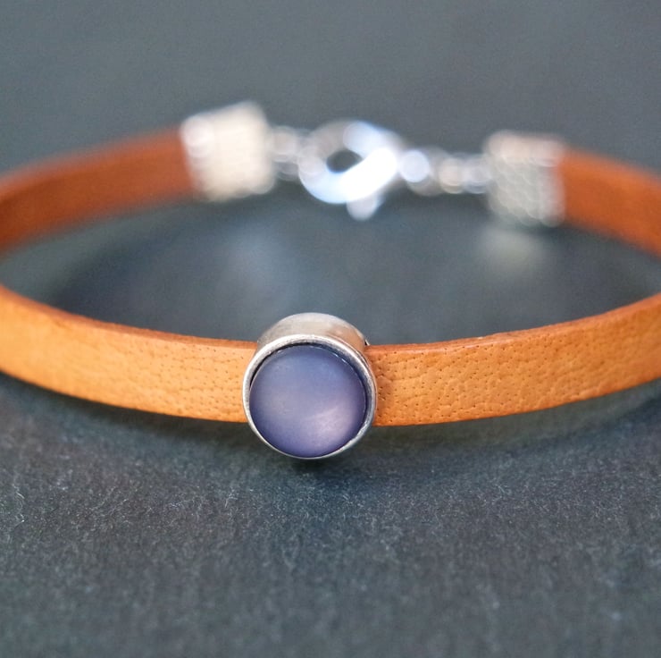 A lovely tan leather bracelet with a dark blue Polaris cabochon in a silver plated setting. The blue and tan give a great contrasting colour scheme and let the leather appear almost orange. Very vibrant and beautiful colours.