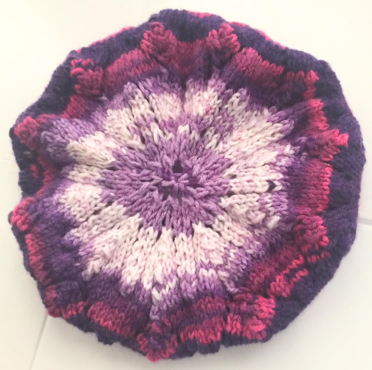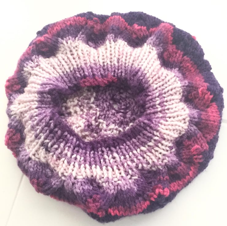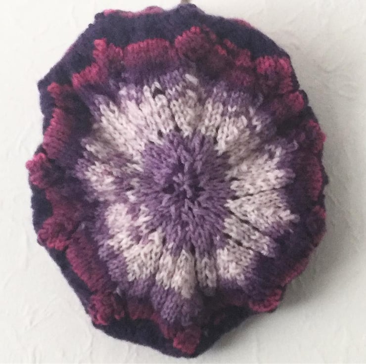 This beautiful beret is hand knitted from self patterning purple tone yarn (100% acrylic). It is knitted with a fancy pattern which adds extra design to this smart hat.