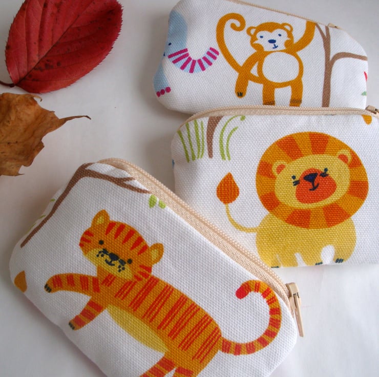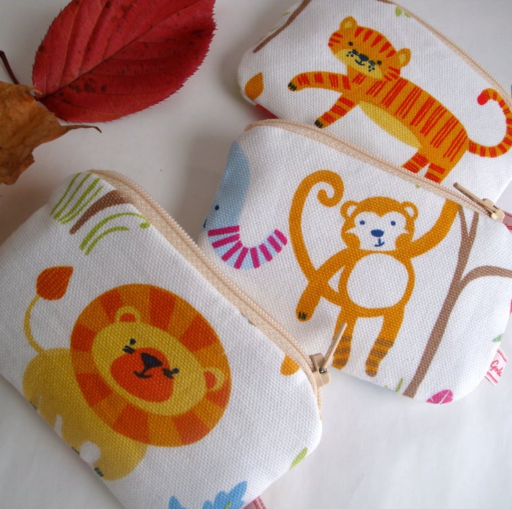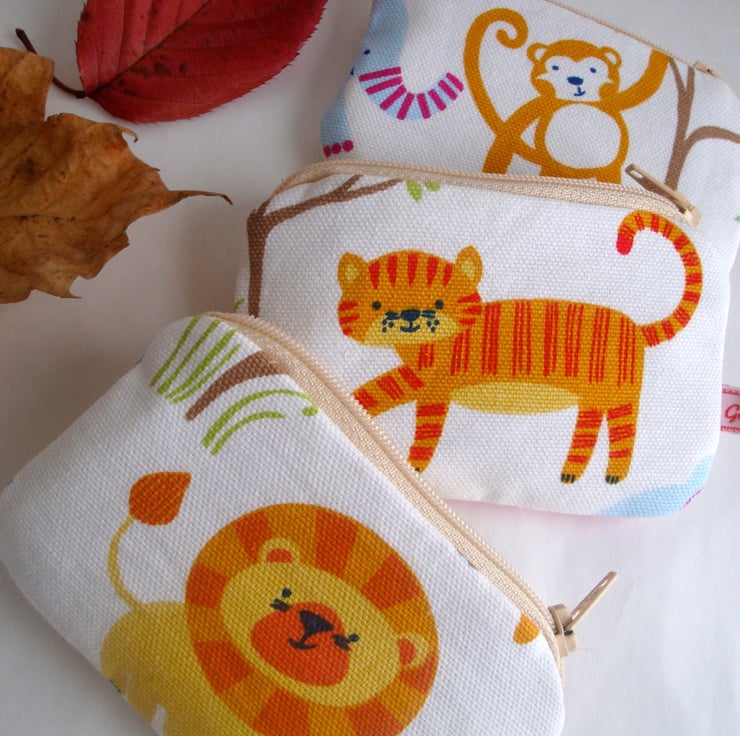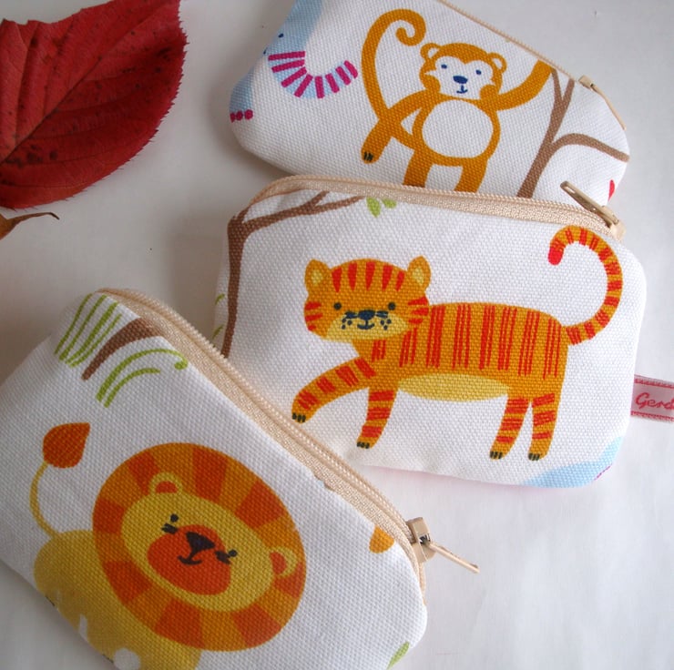 Made in a printed cotton animal fabric - tiger , monkey , or lion ( AT CHECKOUT PLEASE INDICATE WHICH PURSE YOU WOULD LIKE )
