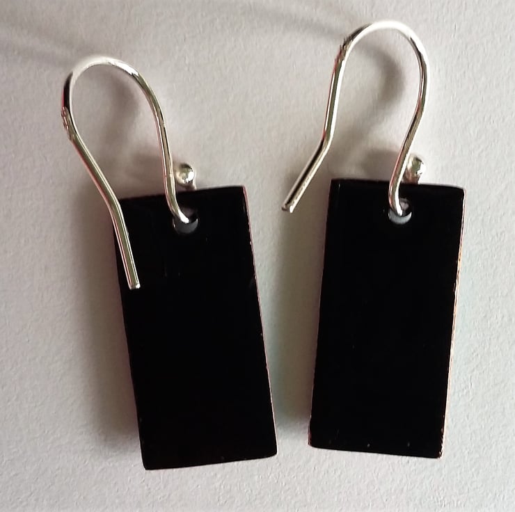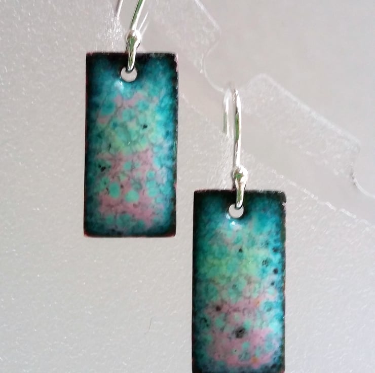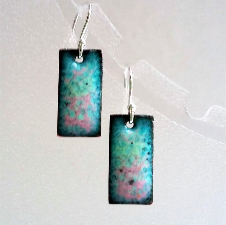 A pair of rectangular copper earrings enamelled in shades of pink and green with dark edging. The earrings have been kiln-fired and each measures 10mm wide and 20mm long, and come complete with sterling silver earring wires. The backs have been finished in glossy black enamel. They are supplied with a little organza pouch and POSTAGE IS FREE!