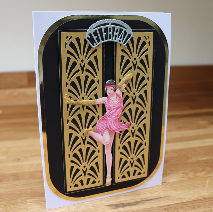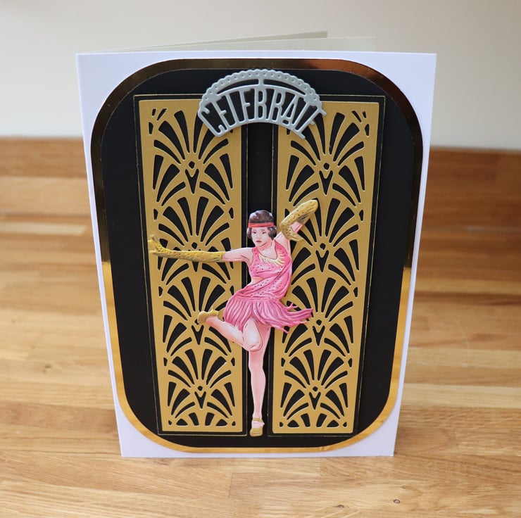 This card is made with 220 gsm white card and then a mat and layer of gold mirri card and black card, then I cut out this art Deco pattern in gold card and mounted it on black card which I edged in gold ink, Happy Birthday is written inside the card,also on the front of the card is a flapper digging that 20s jazz and celebrate is at the top as a sentiment, comes with a envelope.