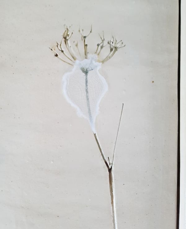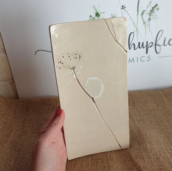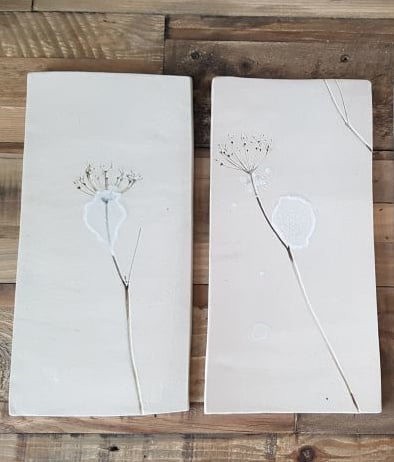 This one-off pair of bespoke ceramic wall tiles have been impressed with real leaves, flowers and stems to create a wild meadow picture. The picture is split into 2 separate tiles.