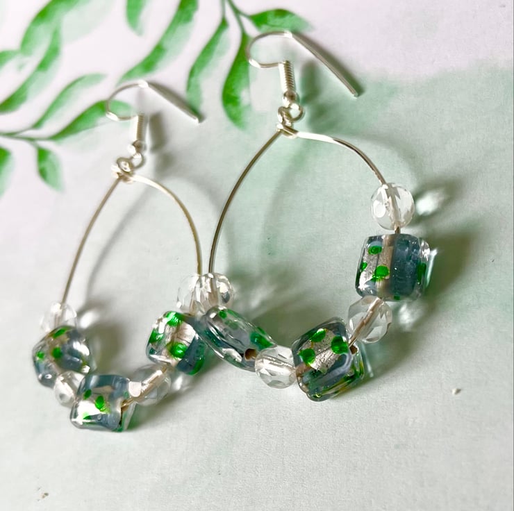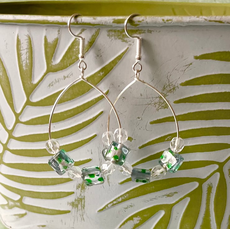 They have been made with faceted clear glass beads, 6mm in size and 3 square glass bead with green speckled foil inclusion. The hoop itself is 40mm x30mm, so quite sizeable and made with silver plated copper wire. The ear hook is also in silver plated copper.