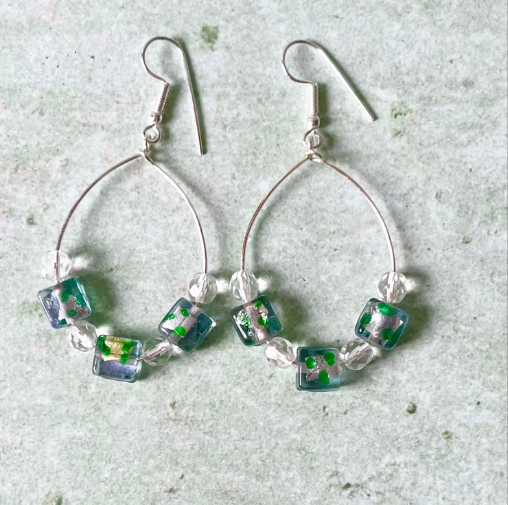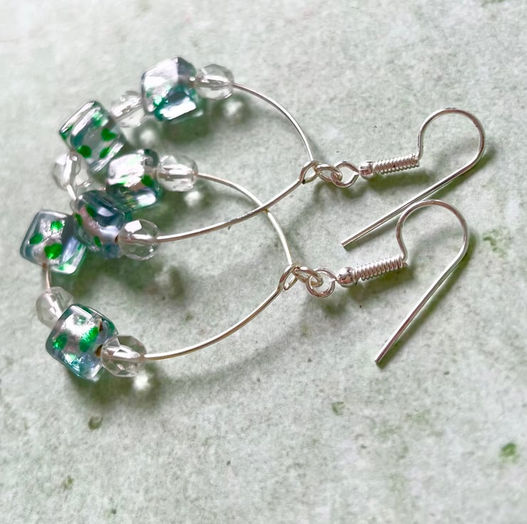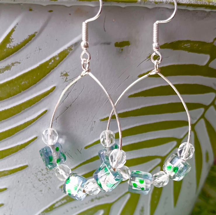 They have been made with faceted clear glass beads, 6mm in size and 3 square glass bead with green speckled foil inclusion. The hoop itself is 40mm x30mm, so quite sizeable and made with gold plated copper wire. The ear hook is also in gold plated copper.