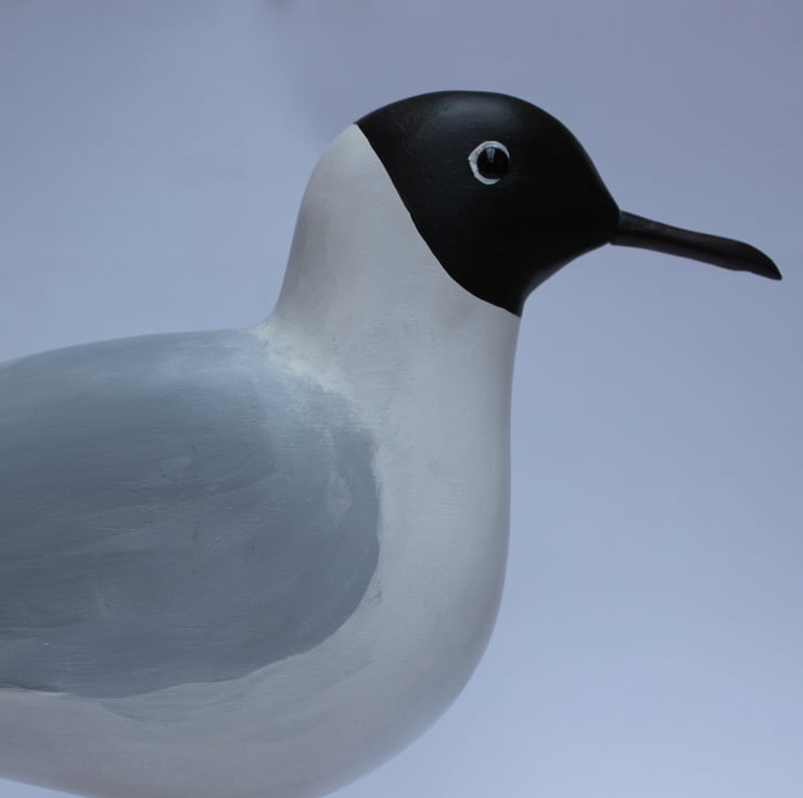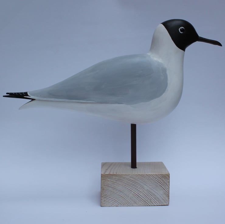 This is a hand carved and hand painted black headed gull. I have set in glass eyes and it has crossed tail feather detail. It has been painted with artists acrylics and stands in a painted pine block that has been sanded back to show the grain. It is 26cm tall, 31cm beak to tail 6cm deep (block 7cm)