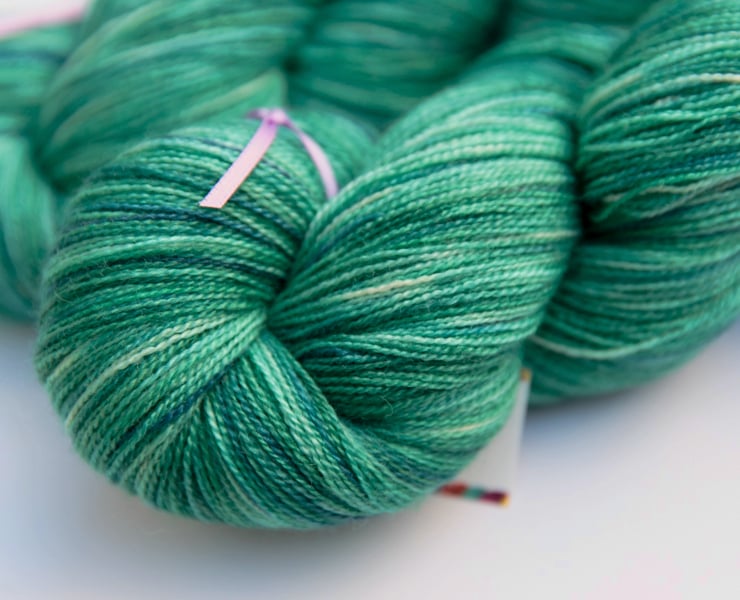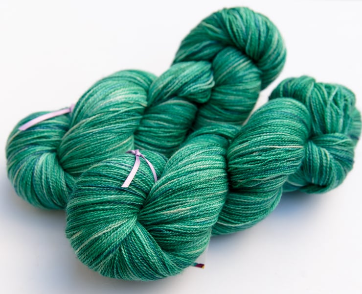 Sea greens, aqua and a little teal-blue. This lustrous, lofty, silky-soft yarn should make beautiful lace projects. There is one skein left. Photographs have been taken and edited in bright but winter natural light.