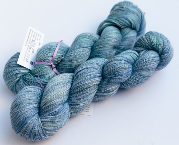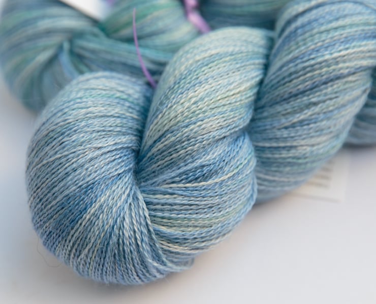 Soft baby blues and palest mint/sea greens. This gorgeous and luxurious yarn has the softness and warmth of alpaca with the smooth sheen and cool feel of silk. It should make beautiful lace projects. There are two skeins available (price shown is for one) - if a further skein is required or a smaller skein is sufficient, a partial skein is available in the Specials and Seconds section at a slightly reduced price. Photographs have been taken and edited in bright but wintery natural light.