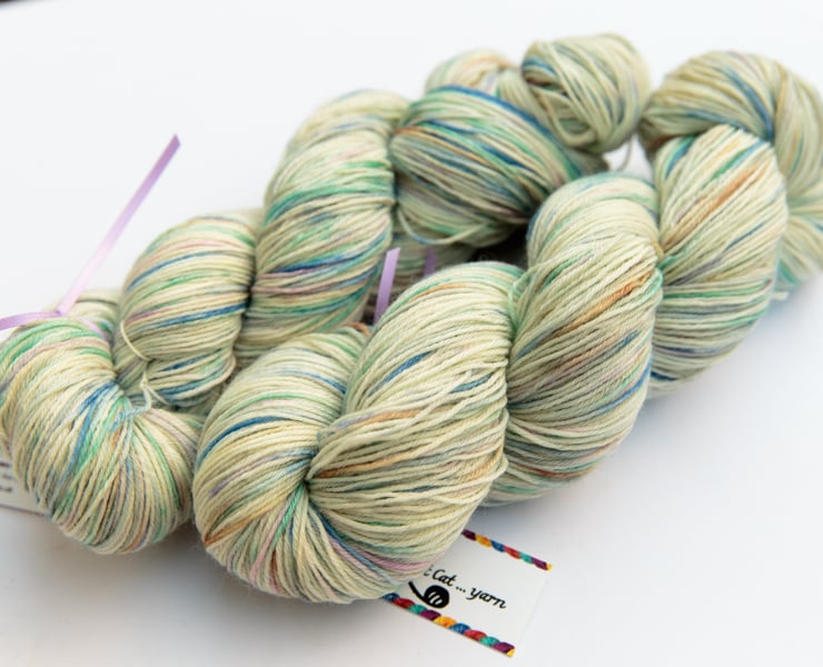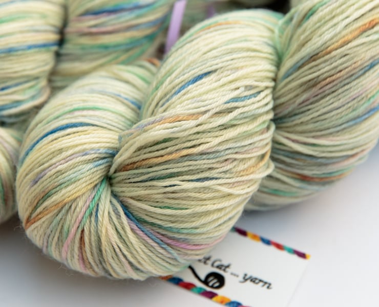 Off white/cream (undyed) with pastel hints of blue, pink, green and tan. This is a standard 4-ply 'sock' yarn with a nylon content to add robustness. There is one skein left. Photos have been taken and edited in bright but wintery natural light.