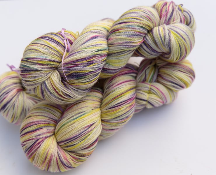 Off-white/cream (undyed) with splashes of lemon yellow, pink, violet and a little teal green. This lustrous, silky-soft, slightly fuzzy yarn with a subtle but almost shimmery sheen should make beautiful lace projects. There are three skeins available (price shown is for one0. These skeins have been dyed together but have differences in colour proportions and blending, so if you plan to use two or more in the same project, alternating skeins as you work is recommended. Photographs have been taken and edited in bright but wintery natural light.