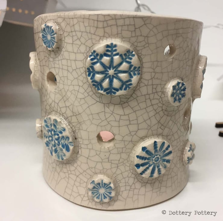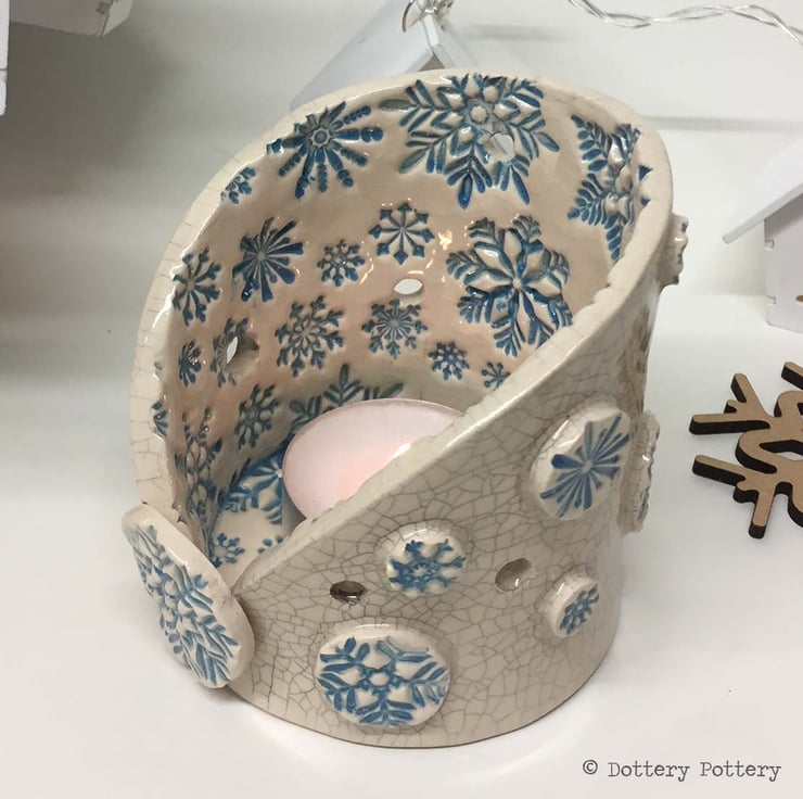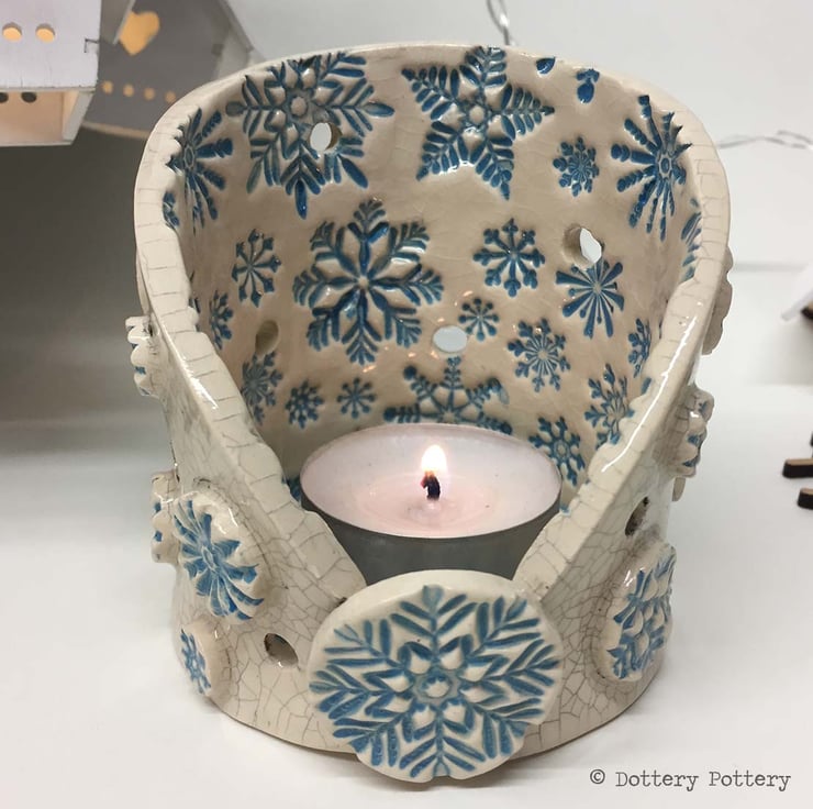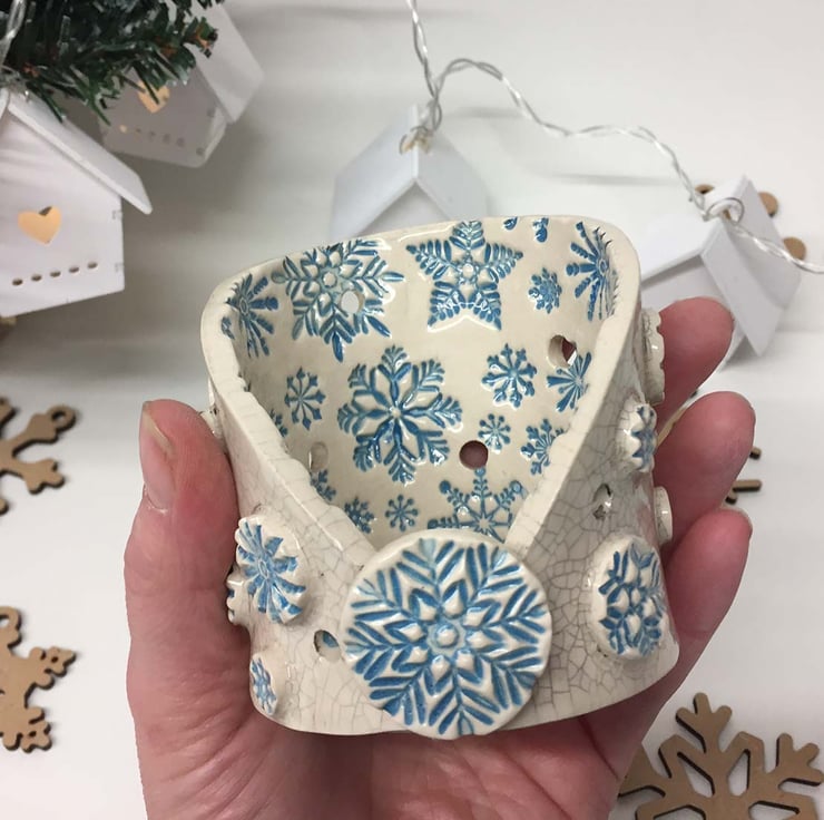 This little candle holder has a snowy, wintery theme. It is made from white earthenware clay in my popular tea-light holder design with embossed snowflakes and a button style embellishments.