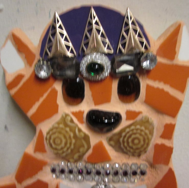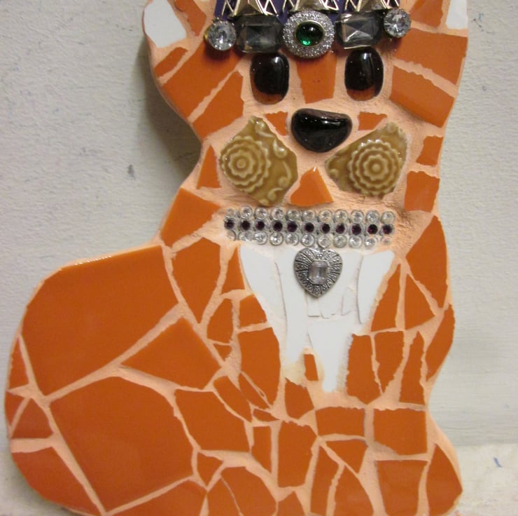 This mosaic Corgi comes with a crown it is made from tiles with a collar of jewels. it is 14cm x 25cm in size and has a hanging attachment on the back