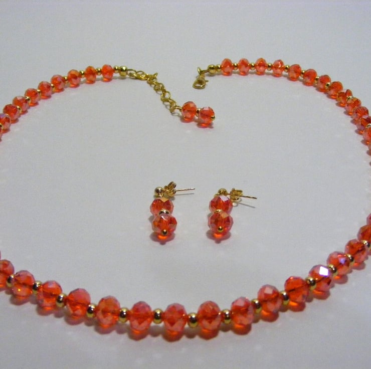 I have made this sparkling jewellery set which consists of a necklace with matching earrings. I've used 6 x 8 mm orange crystal rondelles and 4 mm gold plated spacer beads for the necklace. Beads are threaded onto beading wire and the ends finished with gold plated findings. I've attached a gold plated lobster clasp and extension chain to complete the necklace.
