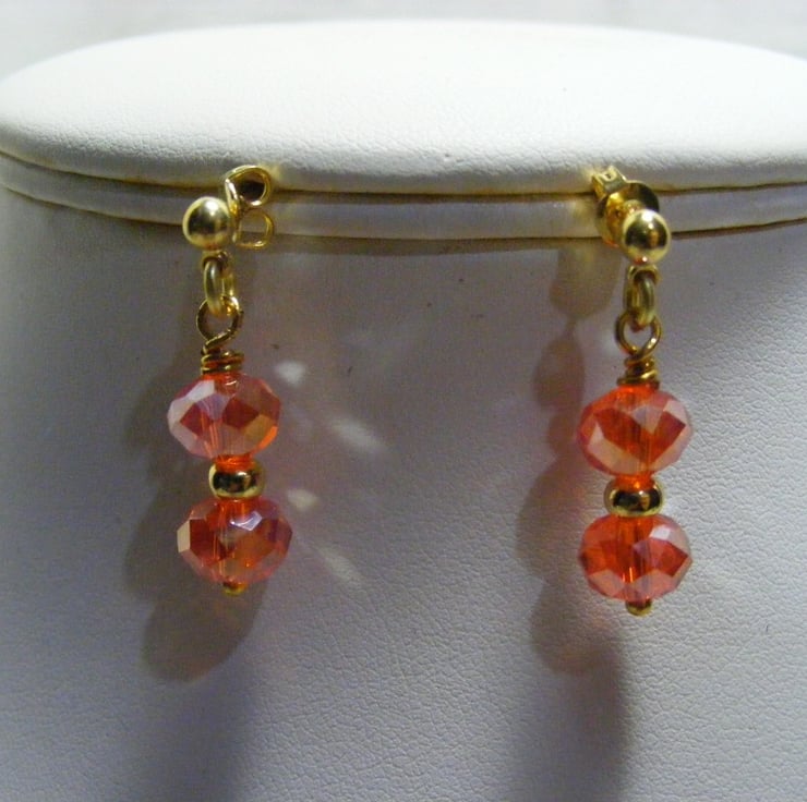 I have threaded orange crystal rondelles onto gold plated ball headpins with a gold plated spacer sitting between to make the earrings. Gold plated studs with butterfly backs are attached to finish.