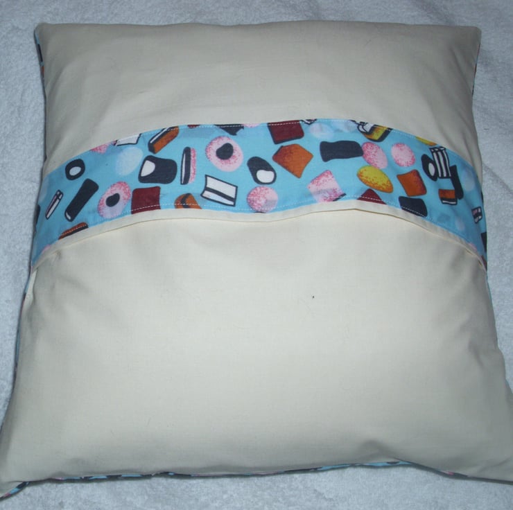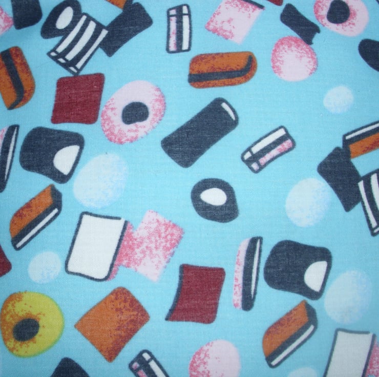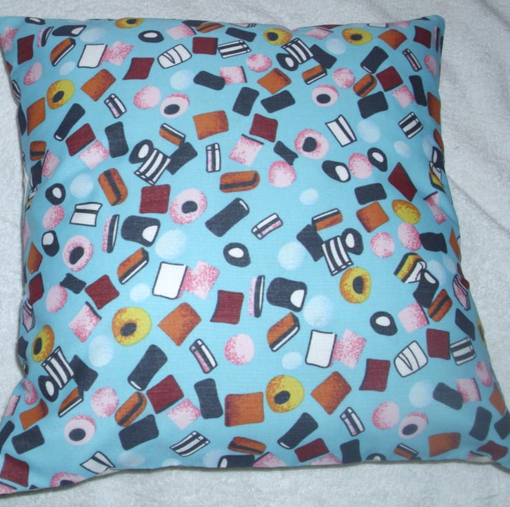 A square cushion with liquorice allsorts tossed all over a pale blue background, a very realistic design.