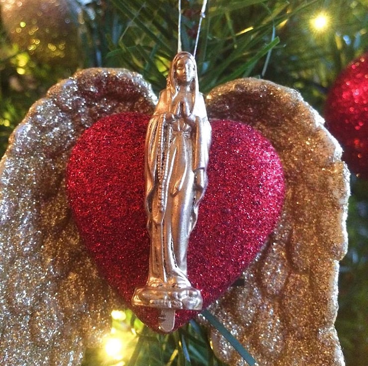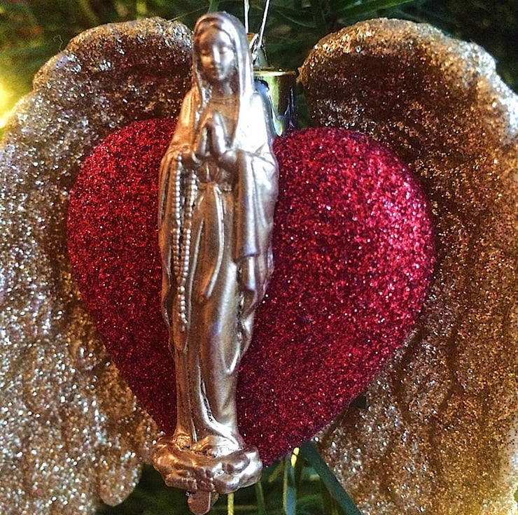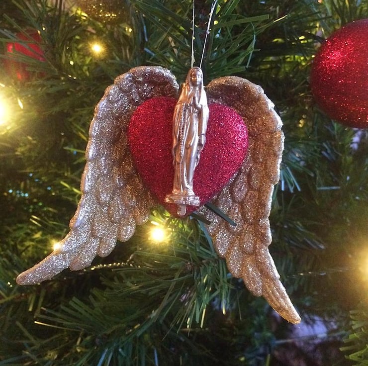 Cute handmade Christmas tree decoration that has a glittery red heart and gold wings with vintage gold statute of the Virgin Mary.