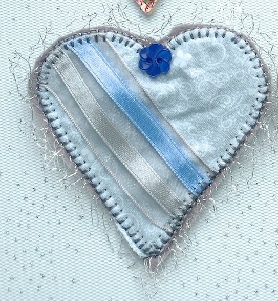 Heart brooch - lovely textile heart shaped brooch made from various blue and grey fabrics and threads, trimmed with a button. A one off original design, no one else will have the same brooch!