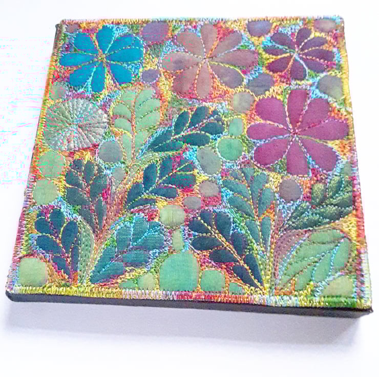 This is a machine stitched picture of leaves and flowers on a canvas.