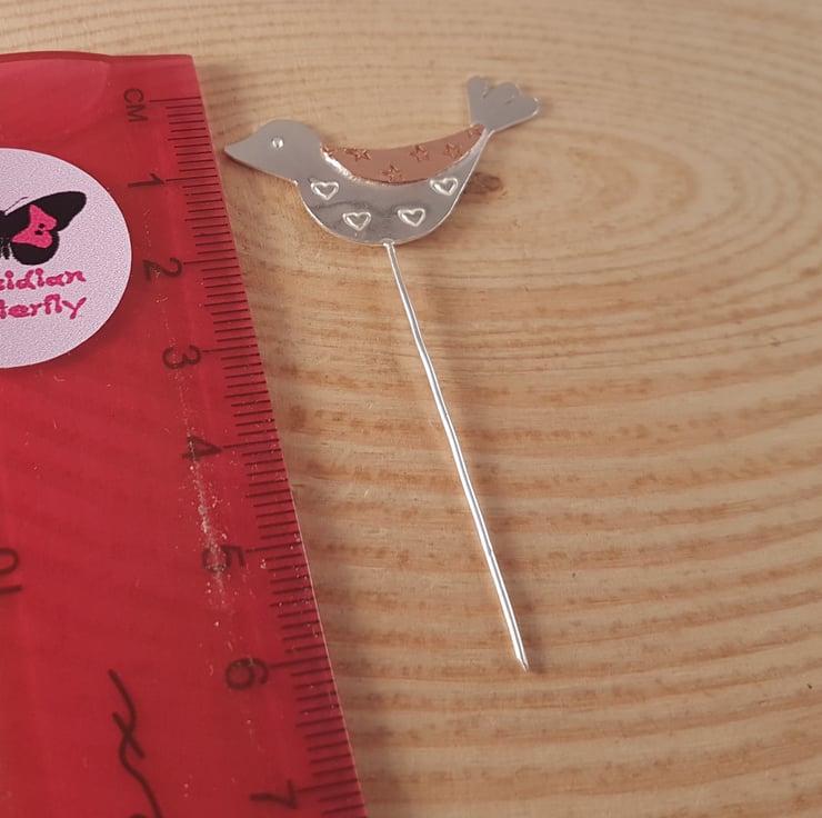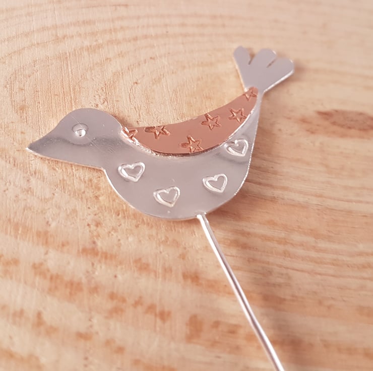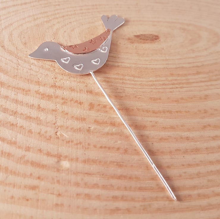 A simple and decorative bird lapel pin, ideal to brighten up your work wear! The shape of a bird has been hand cut from a sheet of silver, and stamped with hearts. A wing has then been cut from copper, and stamped with stars. It has then been soldered on. A pin made of wire has then been soldered on to the bottom, tensioned and sharpened to a point.