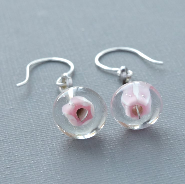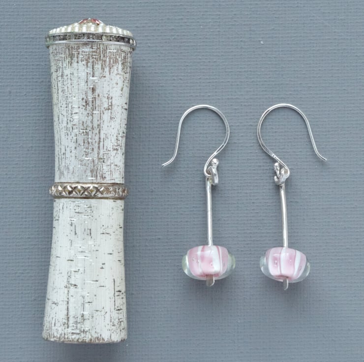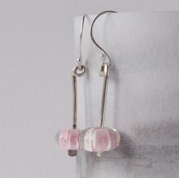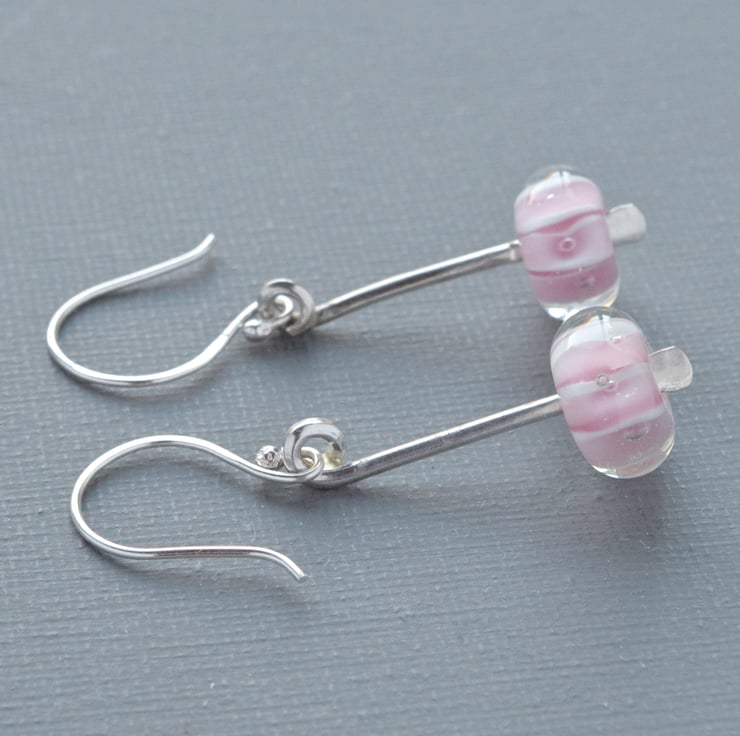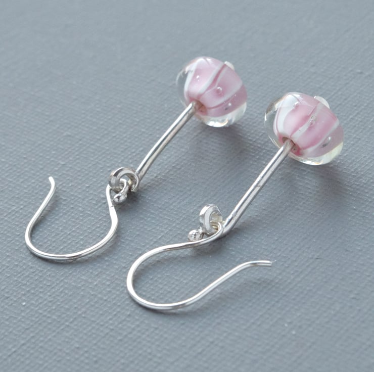 Hand made glass is a great favourite with me. These beautiful pink sea urchin beads were created over a hot lamp using the same technique as is used for paperweights, with a thin coloured core covered with a large drop of transparent glass, which magnifies the design underneath it and gives it a three dimensional quality. These beads remind me of sea urchin shells, which come in shades of pink and green vertical stripes, with little bumps where the spines used to attach. Who would guess on seeing a live sea urchin, like a green/black pincushion, that it had such a beautiful shell. The effect is further enhanced by the cunningly trapped air-bubbles within the glass. Following Minimalist design principles, I treated these beads as simply as possible to turn them into earrings, coiling thick fine silver wire into ram's horn spirals (soldered shut), threading the bead, and then hammering the end of the wire flat to capture the bead. The beads are free to move up and down the wire, and the hammer marks have been left visible for texture. The earrings are mounted on my own, hand forged, sterling silver fish hook ear wires made at my home in West Sussex. Each earring measures 47 mm 1 7/8" in length and 14 mm 1/2" at it's widest point across the bead.