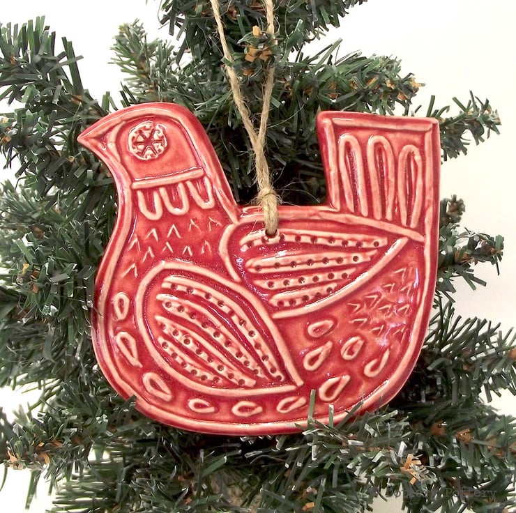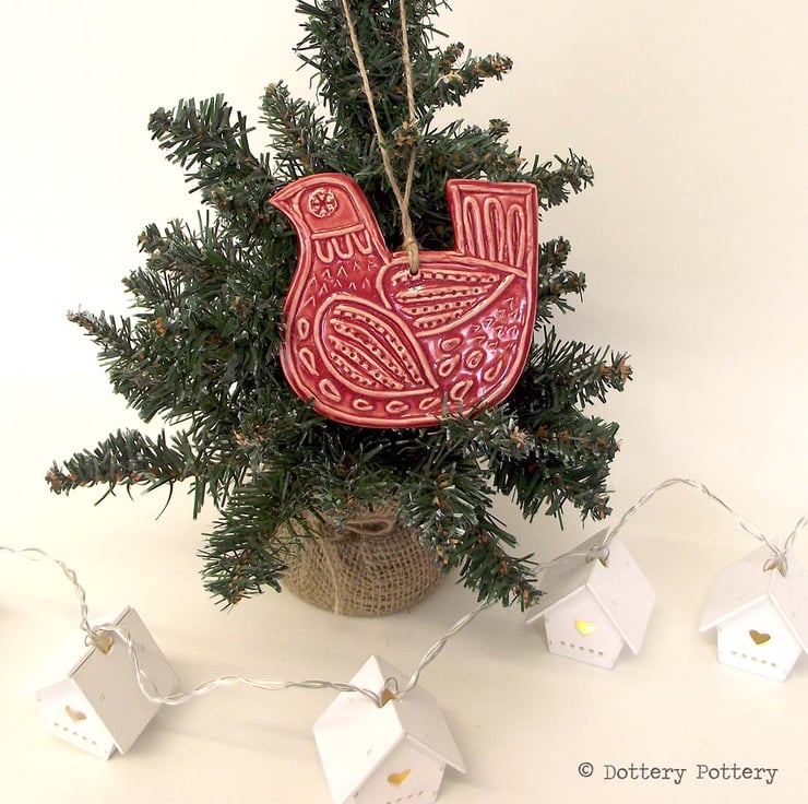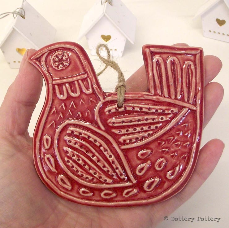 This highly decorative Ceramic bird decoration has been imprinted from my own lino cut design and made from white earthenware clay.