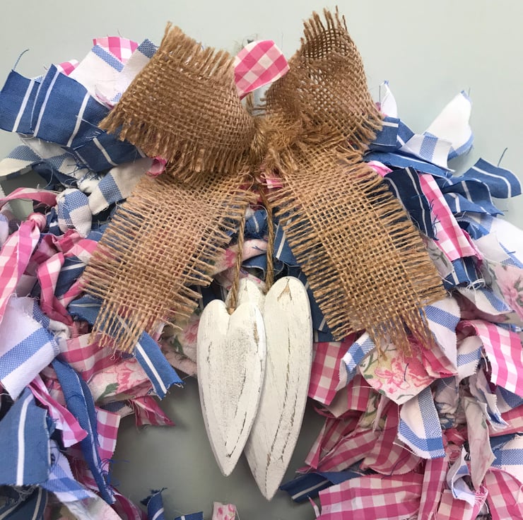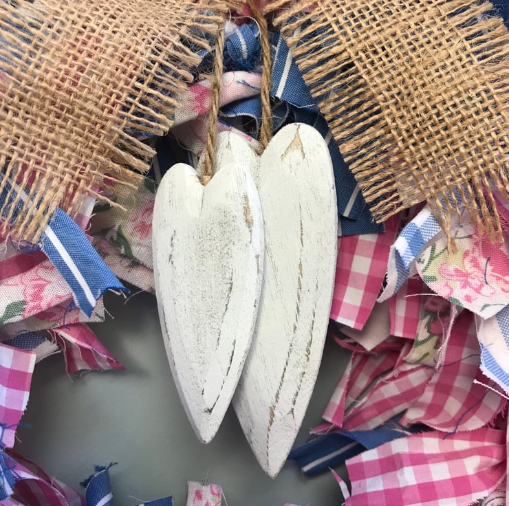These shades of pink and blue would look lovely all year round. The wreath is finished with burlap and painted wooden hearts.
