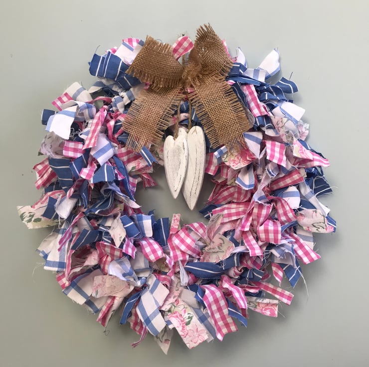 Pretty rag wreath made from recycled shirts and printed cottons and hours of knotting!